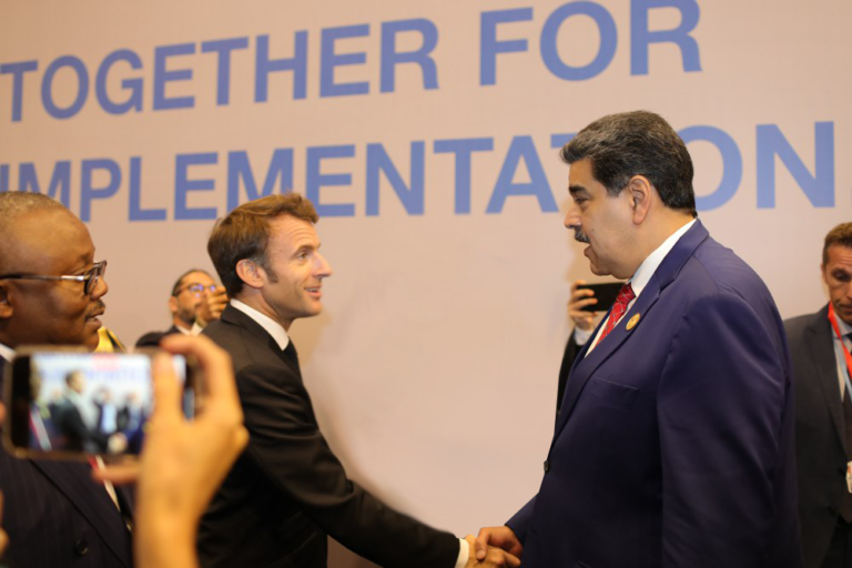 “Me encantaría que pudiéramos hablar un poco más y pudiéramos comenzar un trabajo bilateral útil para el país y la región”, fueron las palabras de Macron al momento de estrechar la mano de Maduro al que le insistió en necesidad de conversar señalando que “presidente, una vez que esto termine yo lo voy a llamar”.