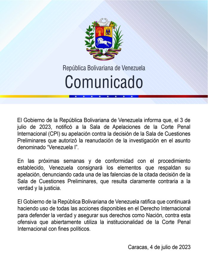 “El Gobierno de la República Bolivariana de Venezuela informa que, el 3 de julio de 2023, notificó a la Sala de Apelaciones de la Corte Penal Internacional (CPI) su apelación contra la decisión de la Sala de Cuestiones Preliminares que autorizó la reanudación de la investigación en el asunto denominado ‘Venezuela I’.